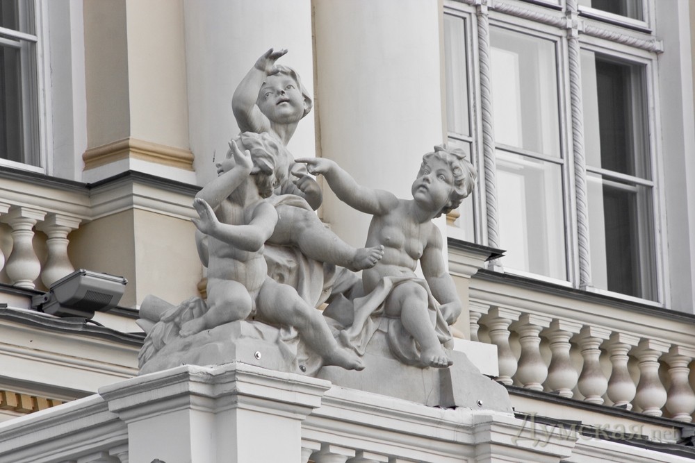 На балюстраде здания расположены 16 фигурок путти (младенцев-амуров), каждая из которых уникальна и не повторяет остальные.